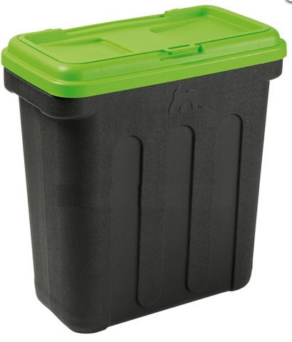 Dimensions : L. 41 x l. 25 x h. 56 cm. Volume 30 litres. plastique résistant, poignées encastrées pour transport facile, hermétique, pour garder les croquettes à l'abri de l'humidité, cuillère de 350 ml intégrée.